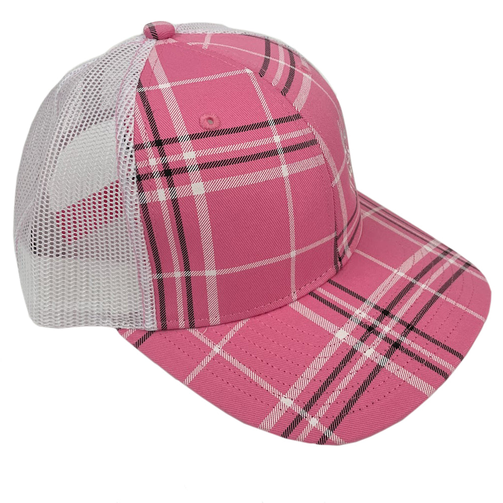 Light, breathable trucker hat with a vibrant pink and plaid design. Showcases the Spider 360 spider off center.